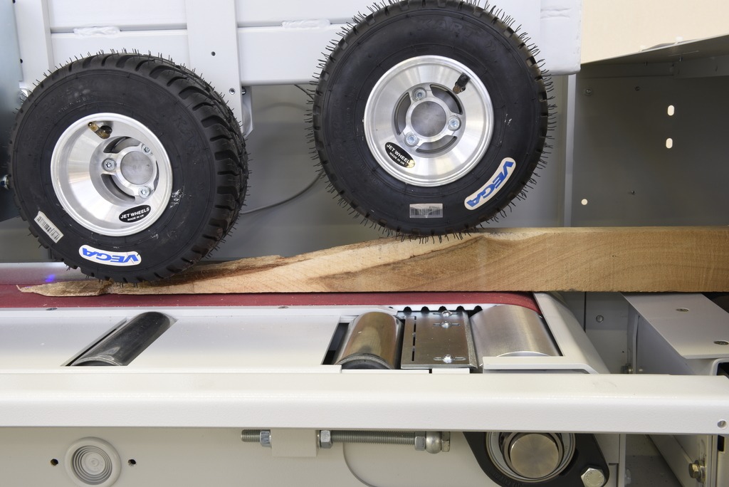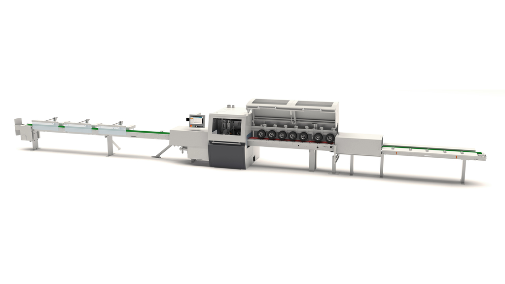 Pierwszy z nich choć najmniej wydajny z wystawionej trójki wyposażony będzie w specjalny pakiet do obróbki „trudnych” elementów takich jak ciężkie i szpiczaste deski. Dobry posuw ciężkich elementów umożliwia specjalny ząbkowany łańcuch posuwowy oraz system dociskowy w którym standardowe rolki zastąpiono oponami. Do obróbki szpiczastych elementów stosowany jest specjalny detektor umożliwiający wykrywanie szpicy i zaklasyfikowanie ich jako odpadu.