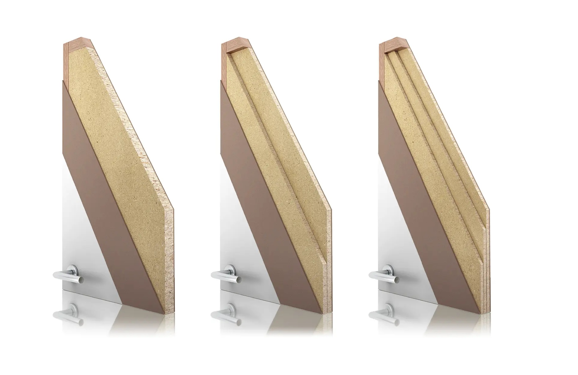 - 33S3G (3x9mm VL + 2x3mm korek gumowy) – płyta o grubości 33mm i własnościach akustycznych skrzydła drzwiowego z wypełnieniem daną płytą wiórową* – wg badań w laboratorium producenta – 42dB