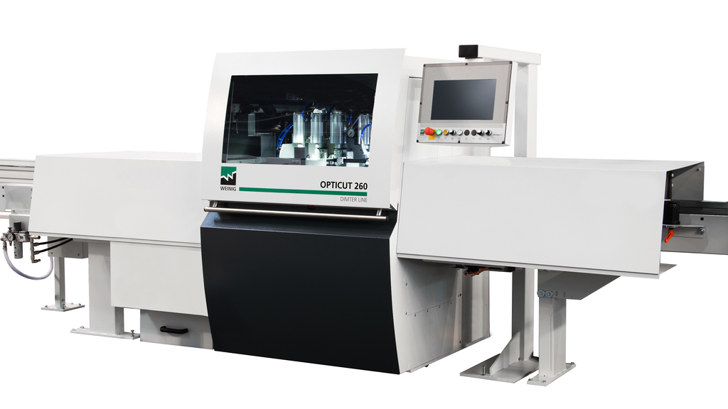 Dimter OptiCut260 oraz skaner Luxscan EasyScan Smart – zestawienie maszyn, które pokazują jak można optymalizować cięcie drewna przy użyciu niewielkiej linii wykorzystującej technologię sztucznej inteligencji. Skaner skanuje 4 stronnie elementy, które następnie przekazywane są taśmą do optymalizerki OptiCut 260. Na podstawie listy cięć wysyłanej przez skaner do pilarki wycinane są wady a materiał sortowany odpowiednio na poszczególne wyżutniki. Dodatkowo obie maszyny wyposażone są w system do detekcji i wycinania wad zbardzo cienkich desek.